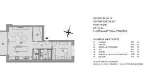 Byt č. 20 je 2-izbový (53,03 m2), nachádza sa na 1.poschodí obytnej sekcie č. 5, prináleží k nemu priestranný balkón (9,40 m2), pivnica a parkovacie miesto. Podrobné informácie k bytu a príslušenstvu sú uvedené v pôdoryse, ktorý je súčasťou galérie.
