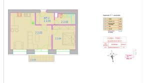 Apartmán č.2 je 2-izbový (56,91 m2), má balkón o výmere 3,47 m2 a pivnicu 2,43 m2. Nachádza sa na 1 poschodí obytného bloku A. Podrobné informácie k bytu a príslušenstvu sú uvedené v pôdoryse, ktorý je súčasťou galérie.