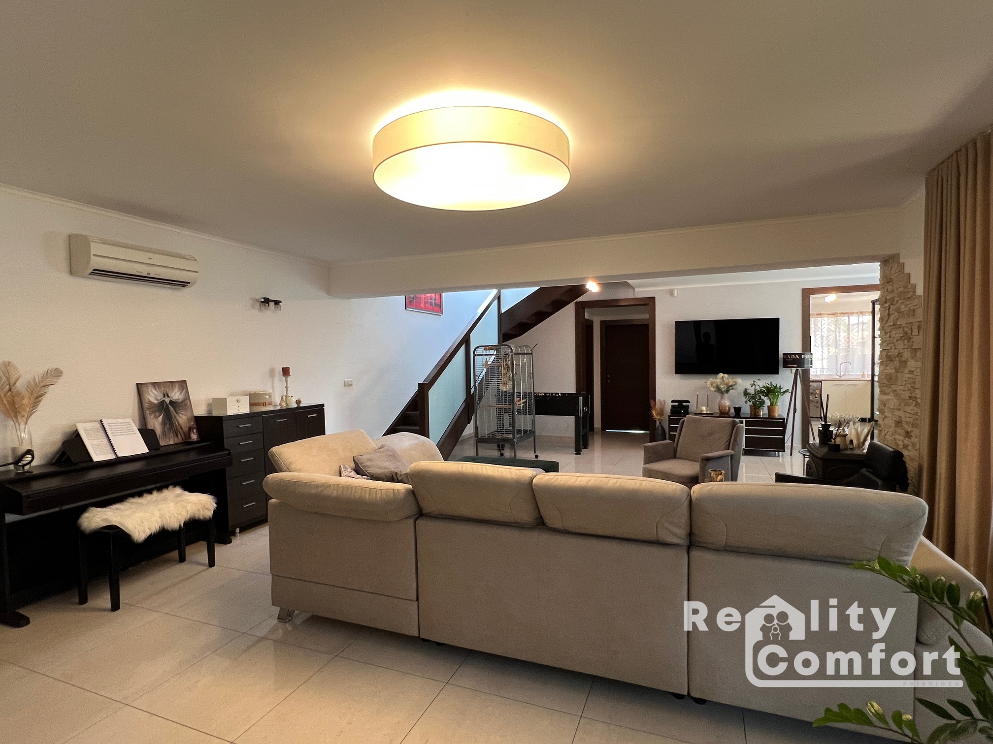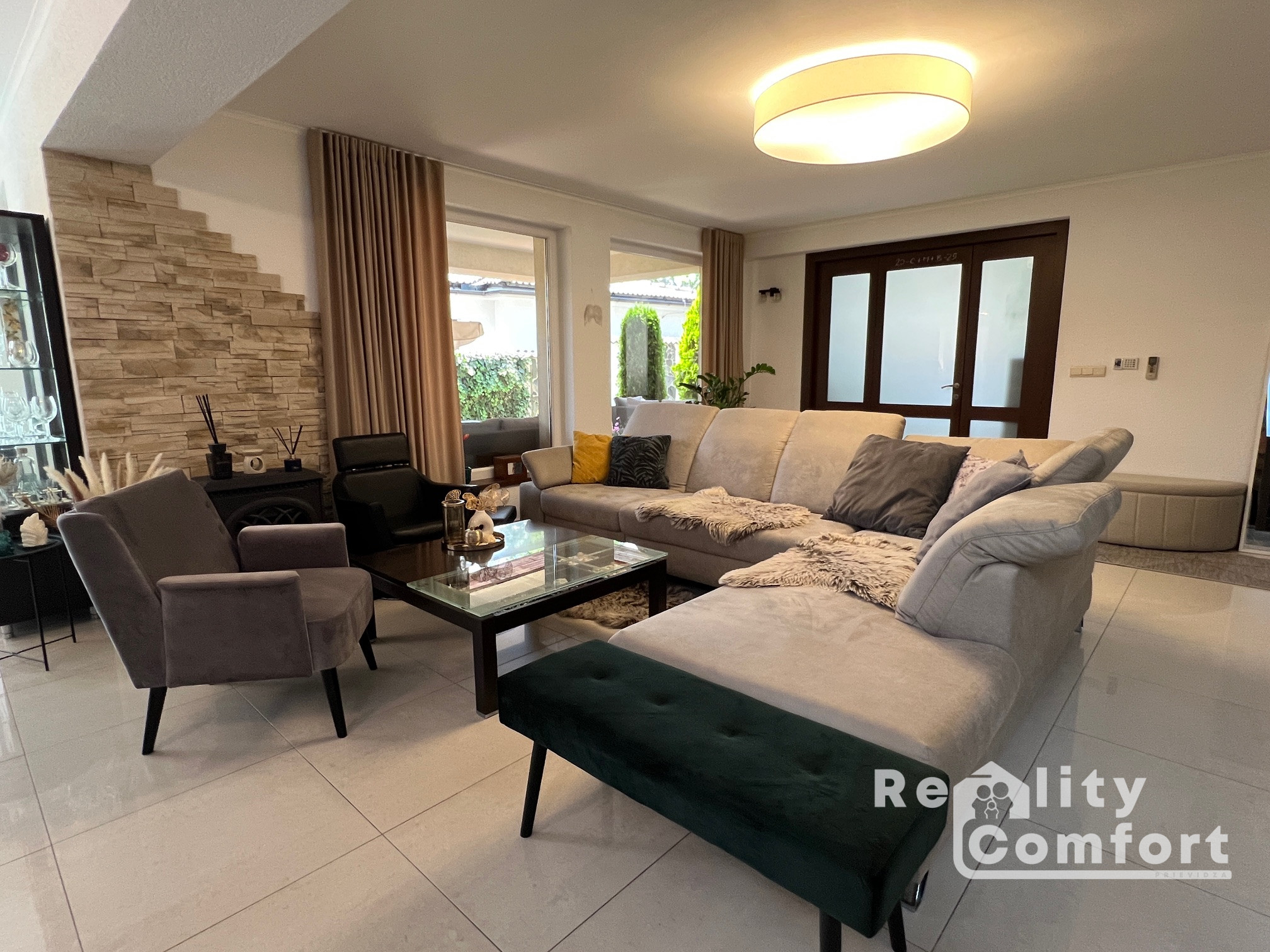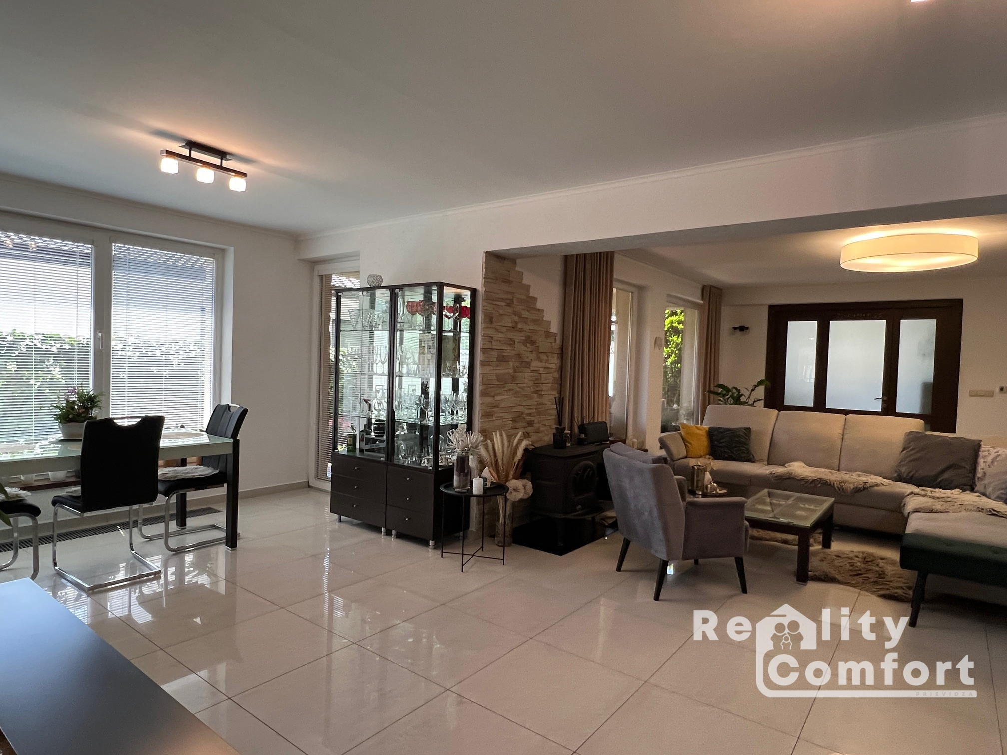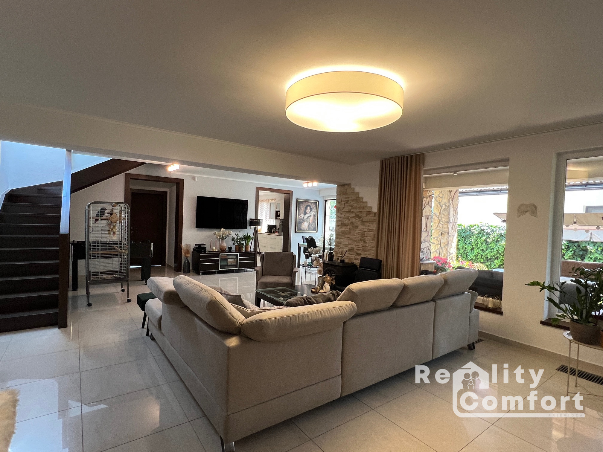 Pri vstupe do domu vás privíta svetlá a vzdušná obývacia izba, ktorá plynulo prechádza do elegantnej jedálne. Tento otvorený priestor je ideálny pre rodinné oslavy aj intímne večery s priateľmi. Z obývacej izby môžete vstúpiť na veľkorysú terasu, kde si môžete vychutnávať rannú kávu alebo večerný pohár vína s výhľadom na nádhernú záhradu. Kuchyňa je skutočným rajom pre milovníkov varenia – moderná, priestranná a vybavená všetkými potrebnými spotrebičmi, doplnená praktickou špajzou pre uloženie všetkých vašich kulinárskych potrieb. Na prízemí sa nachádza tiež samostatné WC a práčovňa, čo zaisťuje, že každodenný život v tomto dome je skutočne pohodlný. Po elegantnom drevenom schodisku sa dostanete na poschodie, kde vás čakajú štyri útulné spálne - každá s vlastným charakterom a atmosférou. Pracovňa poskytuje ideálny priestor pre home office alebo tichú relaxáciu s knihou. Luxusná kúpeľňa s vaňou aj sprchovým kútom je vaším súkromným spa, kde môžete relaxovať po náročnom dni.