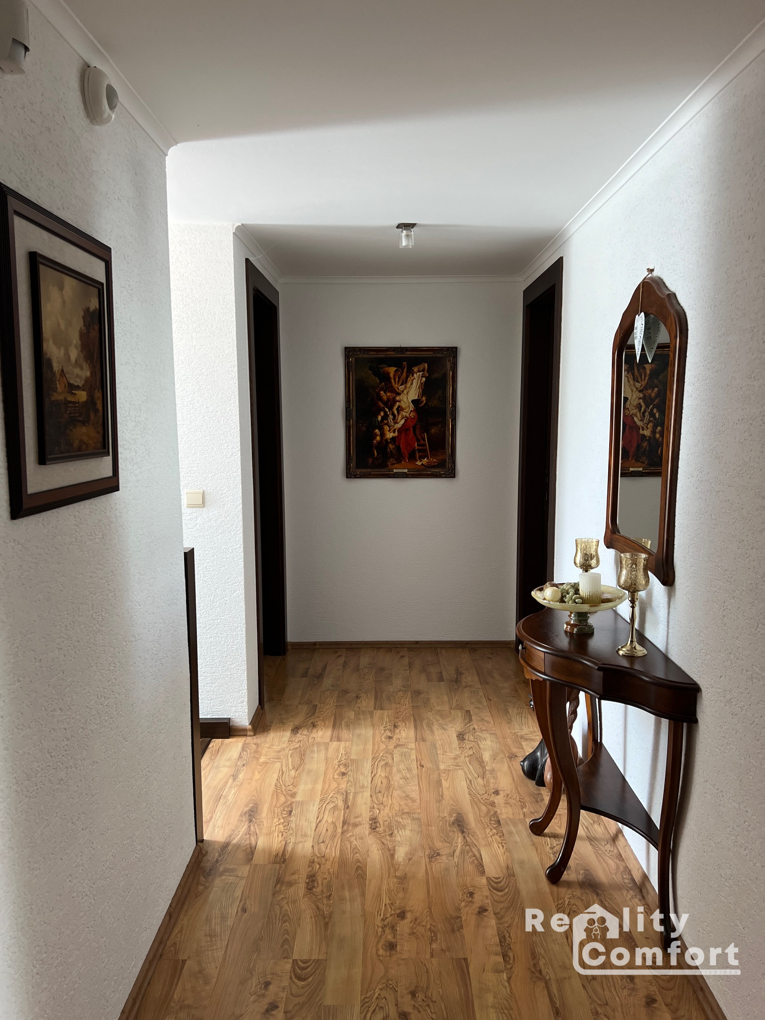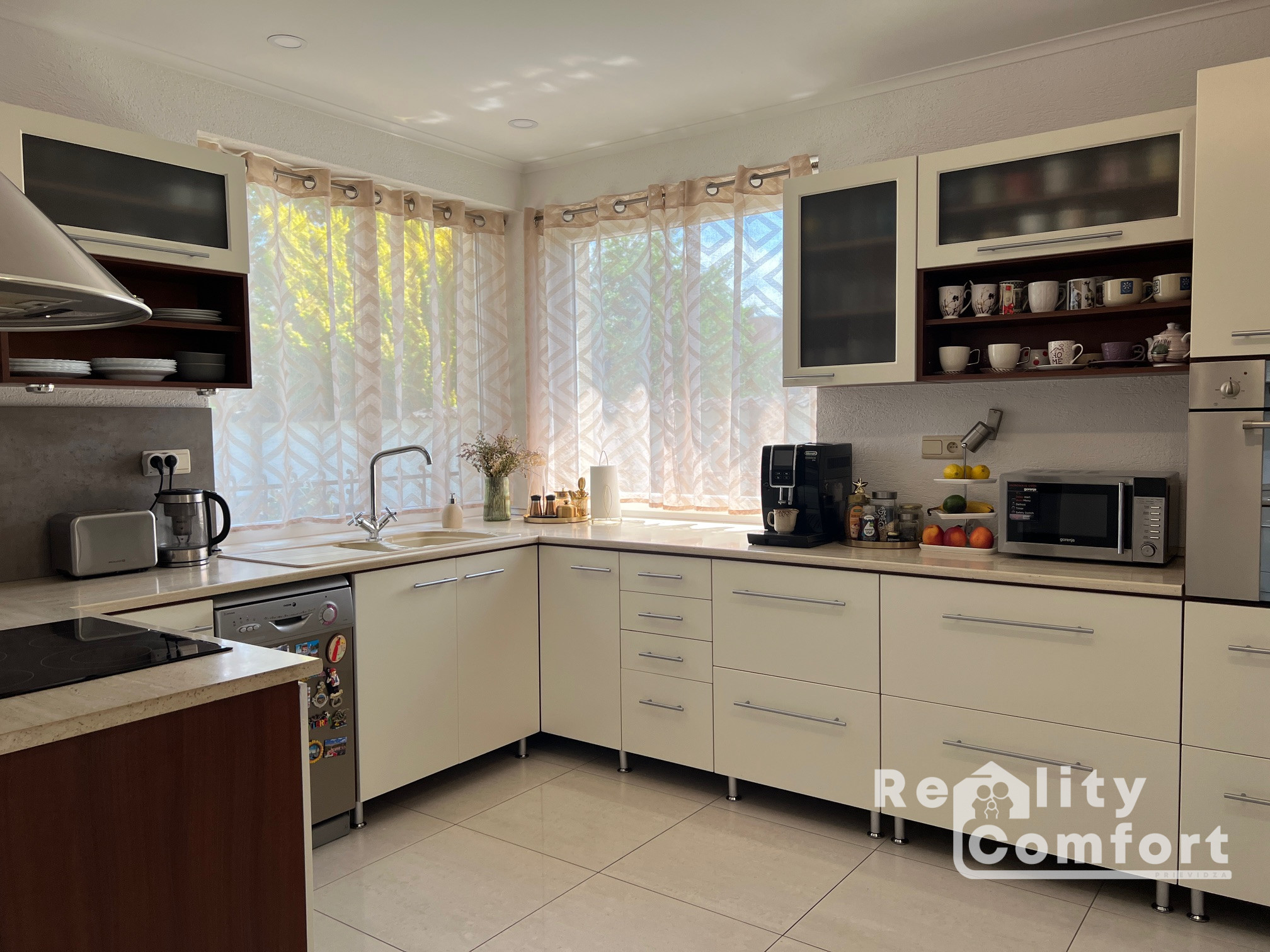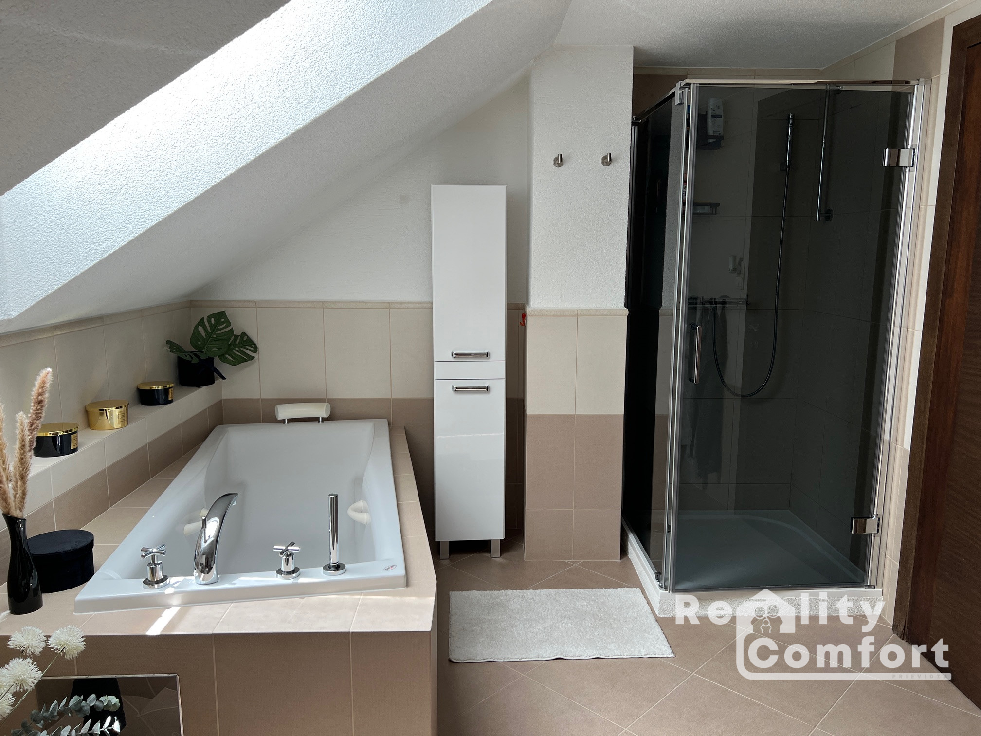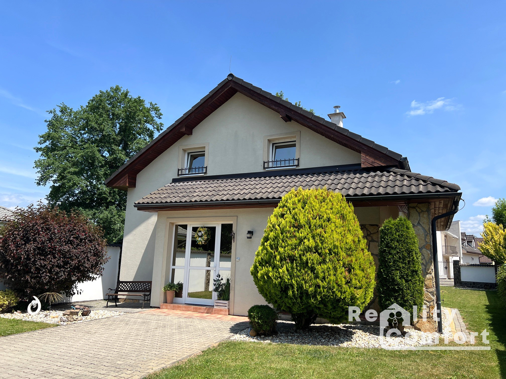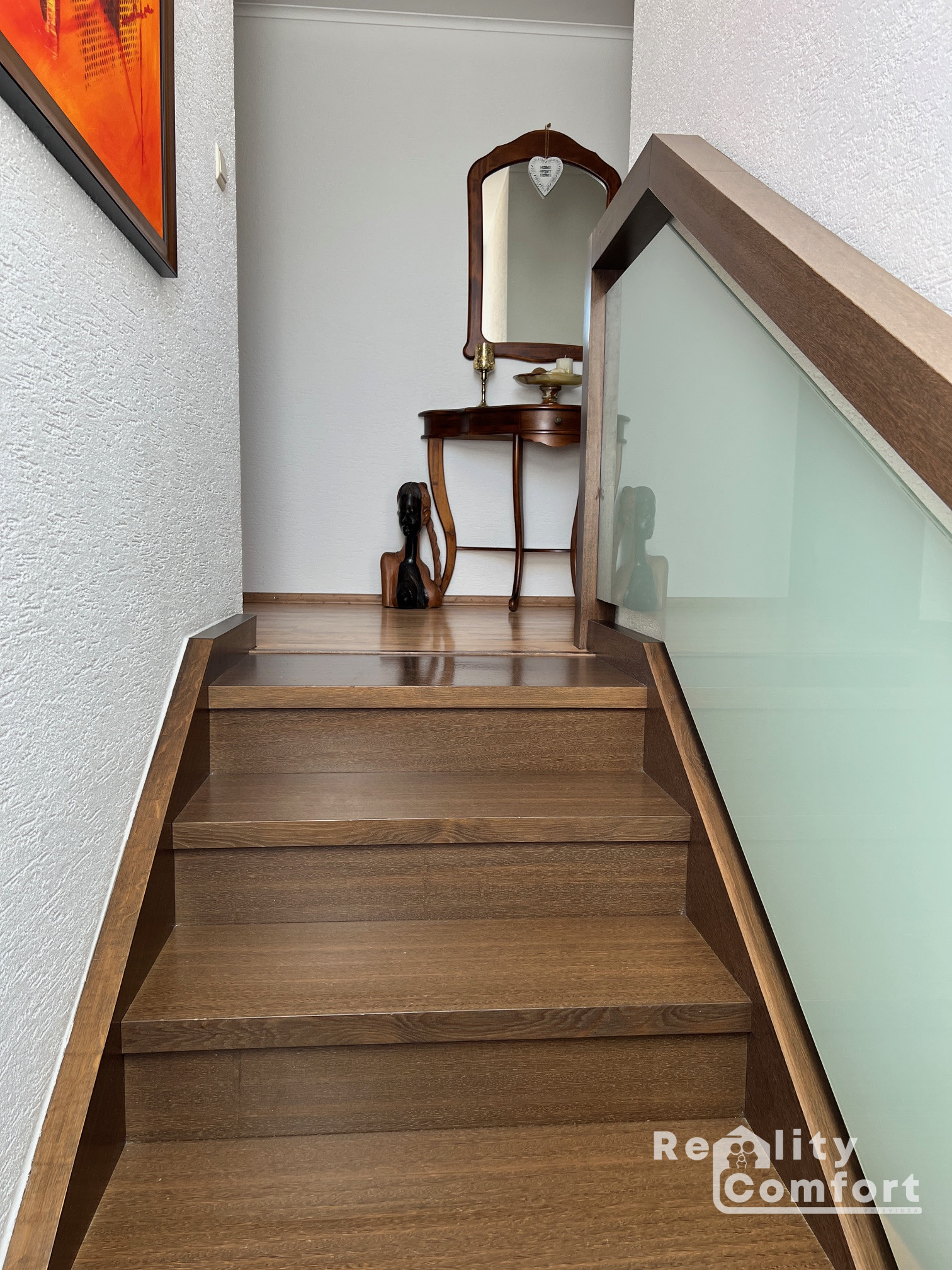 Pri vstupe do domu vás privíta svetlá a vzdušná obývacia izba, ktorá plynulo prechádza do elegantnej jedálne. Tento otvorený priestor je ideálny pre rodinné oslavy aj intímne večery s priateľmi. Z obývacej izby môžete vstúpiť na veľkorysú terasu, kde si môžete vychutnávať rannú kávu alebo večerný pohár vína s výhľadom na nádhernú záhradu. Kuchyňa je skutočným rajom pre milovníkov varenia – moderná, priestranná a vybavená všetkými potrebnými spotrebičmi, doplnená praktickou špajzou pre uloženie všetkých vašich kulinárskych potrieb. Na prízemí sa nachádza tiež samostatné WC a práčovňa, čo zaisťuje, že každodenný život v tomto dome je skutočne pohodlný. Po elegantnom drevenom schodisku sa dostanete na poschodie, kde vás čakajú štyri útulné spálne - každá s vlastným charakterom a atmosférou. Pracovňa poskytuje ideálny priestor pre home office alebo tichú relaxáciu s knihou. Luxusná kúpeľňa s vaňou aj sprchovým kútom je vaším súkromným spa, kde môžete relaxovať po náročnom dni.