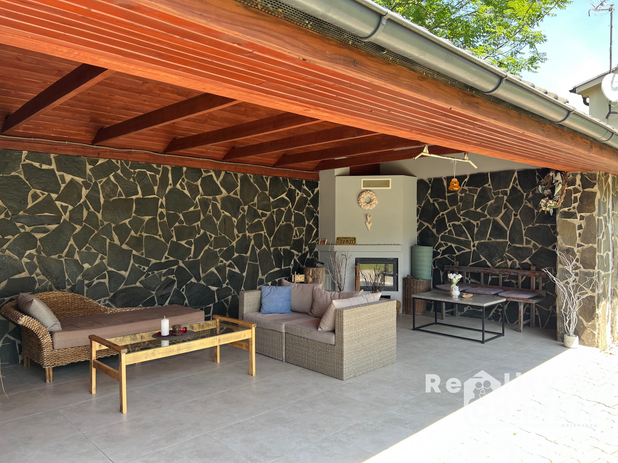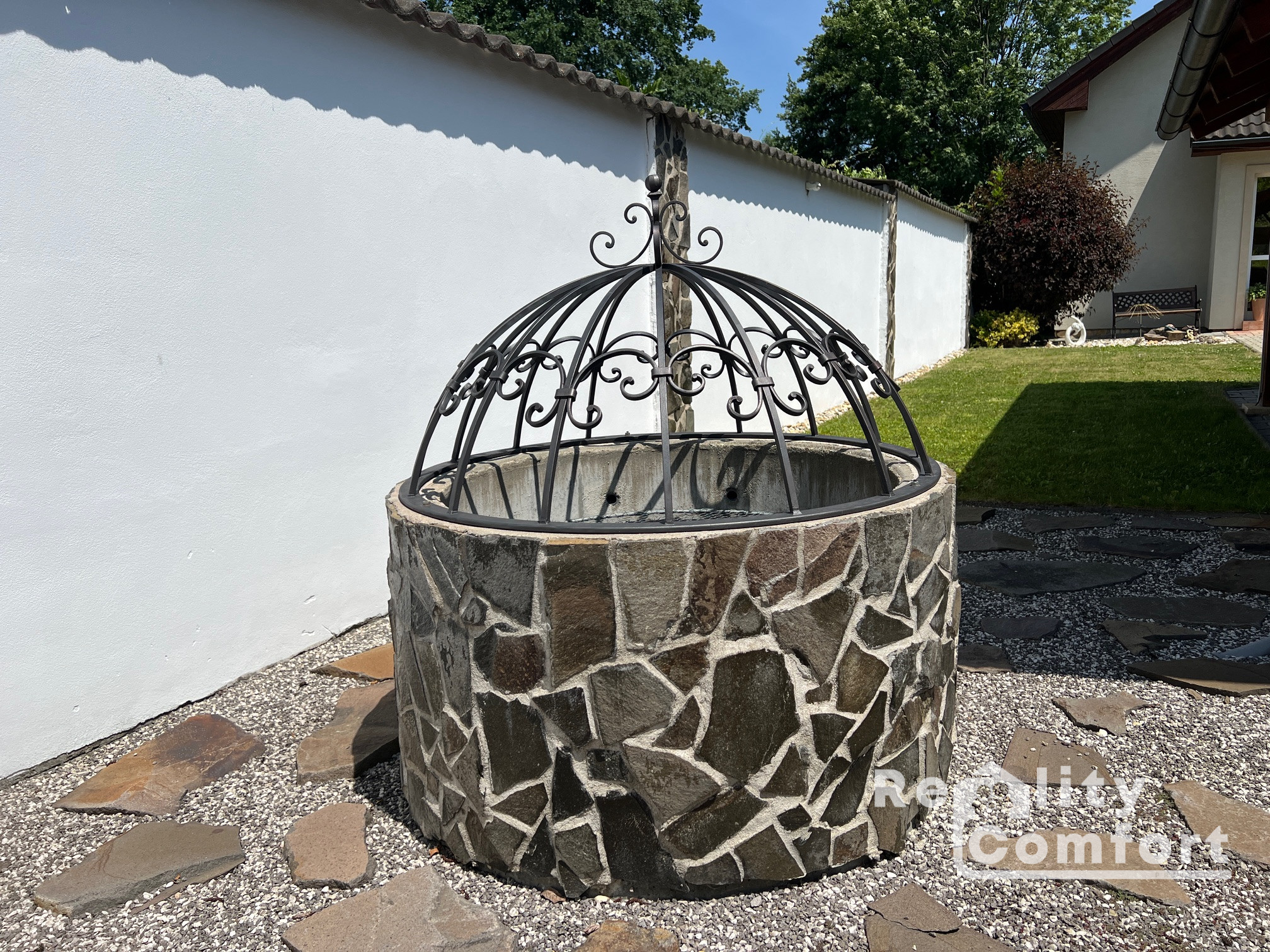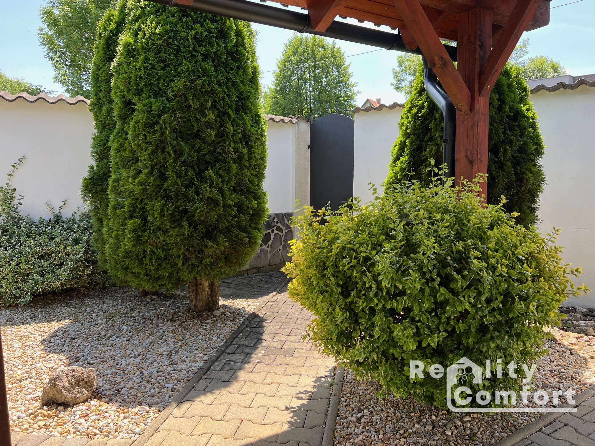 Exteriér domu je rovnako očarujúci ako interiér. Okrasná záhrada je starostlivo navrhnutá tak, aby poskytovala súkromie a zároveň bola ľahko udržiavateľná. Priestranný prestrešený altánok s grilom je ako stvorený pre rodinné barbecue alebo posedenia s priateľmi. Úžitková studňa zabezpečuje dostatok vody na polievanie záhrady, zatiaľ čo praktický sklad dokonale skryje záhradné príslušenstvo. Praktický prístrešok na autá chráni vaše vozidlá pred slnkom a nepriaznivým počasím.
