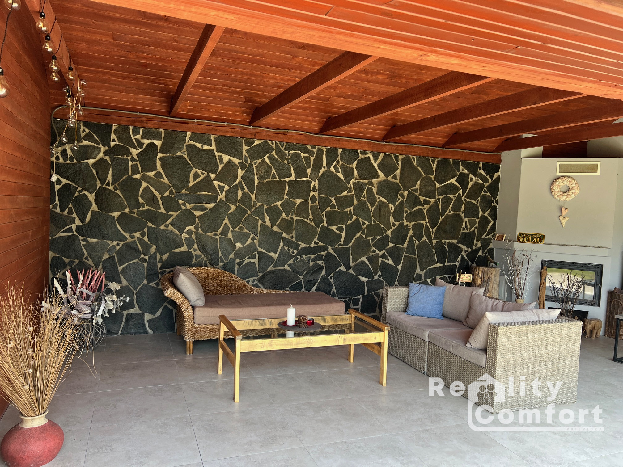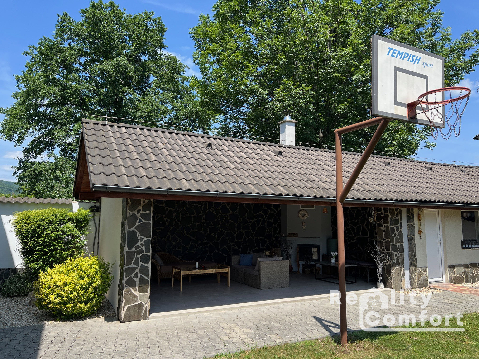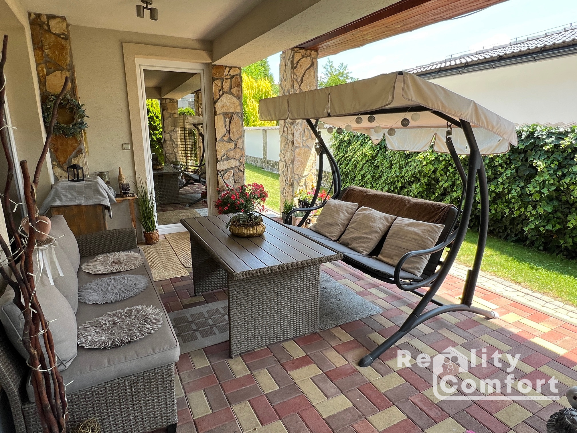 Exteriér domu je rovnako očarujúci ako interiér. Okrasná záhrada je starostlivo navrhnutá tak, aby poskytovala súkromie a zároveň bola ľahko udržiavateľná. Priestranný prestrešený altánok s grilom je ako stvorený pre rodinné barbecue alebo posedenia s priateľmi. Úžitková studňa zabezpečuje dostatok vody na polievanie záhrady, zatiaľ čo praktický sklad dokonale skryje záhradné príslušenstvo. Praktický prístrešok na autá chráni vaše vozidlá pred slnkom a nepriaznivým počasím.