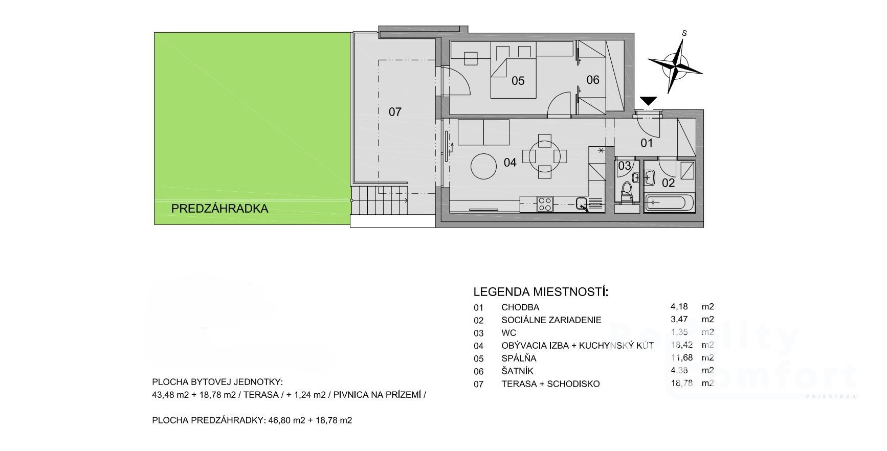 Byt je ideálny pre tých, ktorí si cenia komfort a dizajn. Jeho súčasťou je priestranná terasa s rozlohou 18,78 m² a predzáhradka o výmere 46,80 m², kde si môžete na modernej sedačke vychutnávať rannú kávu alebo relaxovať po náročnom dni. K bytu prislúcha skvelý bonus – pivnica a dve parkovacie miesta, ktoré sú zahrnuté v cene prenájmu a urobia váš život komfortnejším. Optický internet je samozrejmosťou a je taktiež zahrnutý v cene prenájmu.